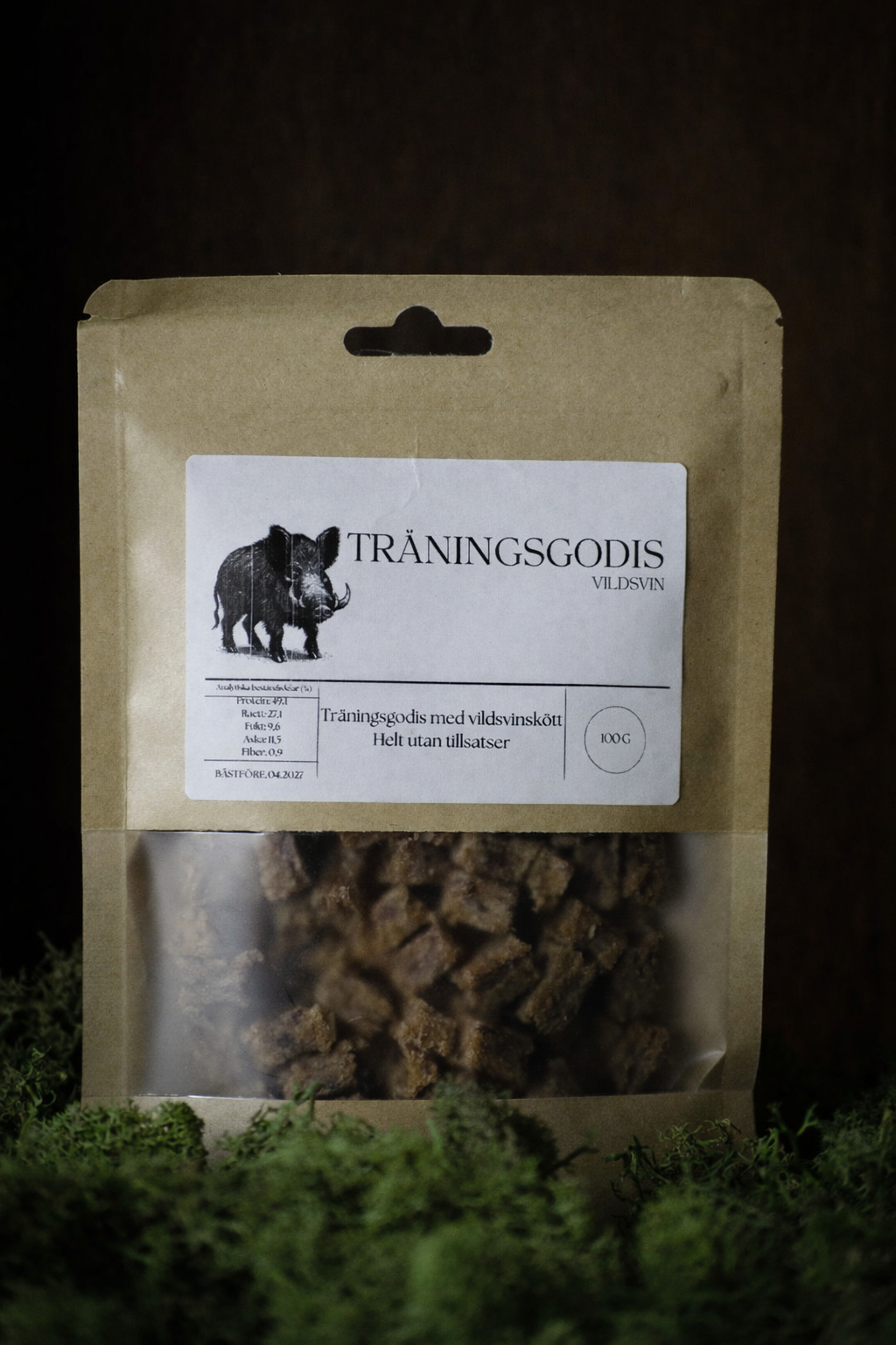 Skäm bort din hund med ett exklusivt och naturligt träningsgodis, dessa mjuka bitar av vildsvin är ett smakrikt och proteinrikt snacks, perfekt för träning, promenader eller som vardagsbelöning.